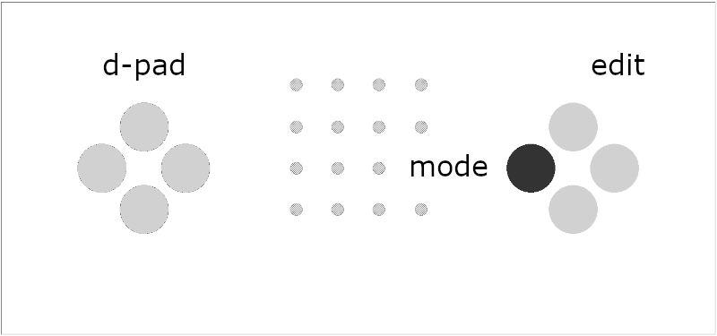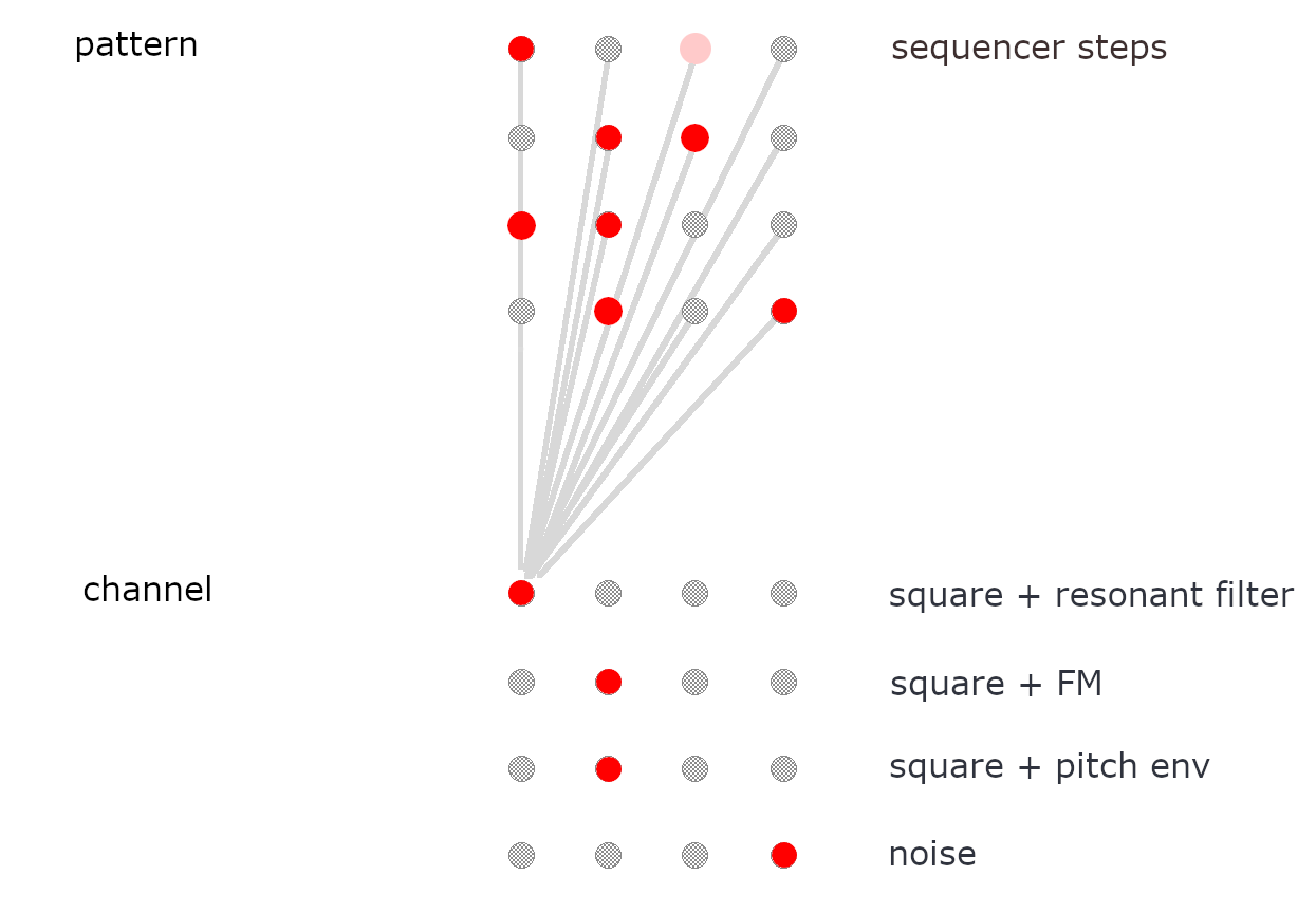 each dot represents a pattern. each row forms a channel with 4 patterns which can be selected with B.